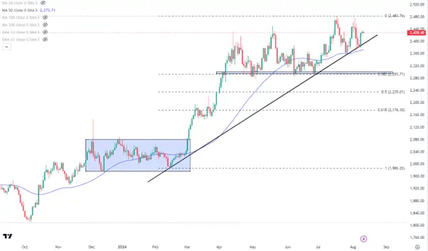 和上周此时相比,黄金的走势结构没有太大的不同,经历V型反转后金价仍运行在趋势线2400和关键的50天均线2373上方。不论是降息或衰退预期都是黄金潜在的利好。若本周美国经济数据不佳加剧衰退恐慌,金价有望冲击历史高点2483,目前还有2%左右的距离。