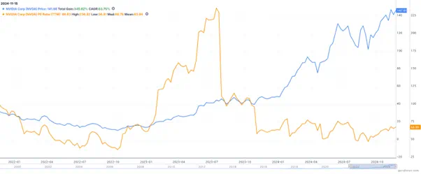 英伟达股价(蓝)和市盈率(黄)(2022-2024)? 来源:Gurufocus