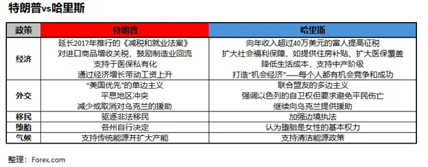 下图从经济、外交、移民、堕胎、气候等五个方面罗列了两位候选人的政策主张。但有多少政策能顺利落地,又有多少是空头支票就不得而知了。若形成分裂国会,会使任何重大立法都难以通过,政策落地难度将大幅增加。