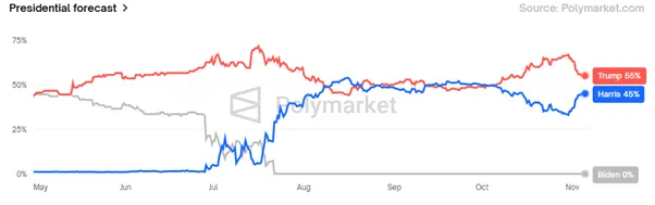 在去中心化的预测市场平台Polymarket上,截至11月3日特朗普以55%获胜概率领先于哈里斯,但领先幅度从上周开始出现缩水。