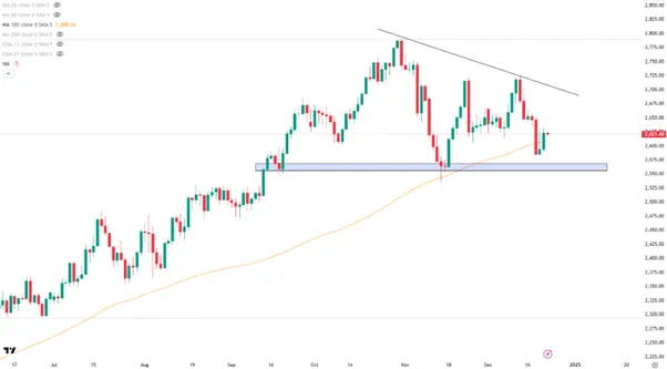美联储上周降息但大幅缩减了对未来几年的降息预期(鹰派降息),帮助美元指数一度突破108关口,而美国三大指数遭遇周线下跌,其中道琼斯指数甚至有一波十天连跌。除了苹果连续五周收涨之外,其他的七巨头普遍高位回落。黄金上周先降后升收于2623美元。