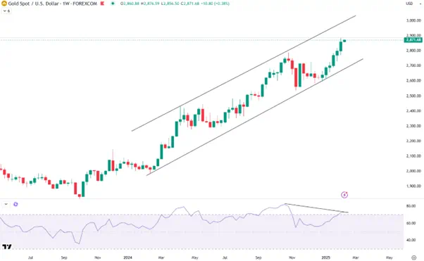 下方支撑上移至2850/60区域,而多头目标自然是2900美元以及更具意义的3000美元整数关口,即周线图中的通道上轨附近。